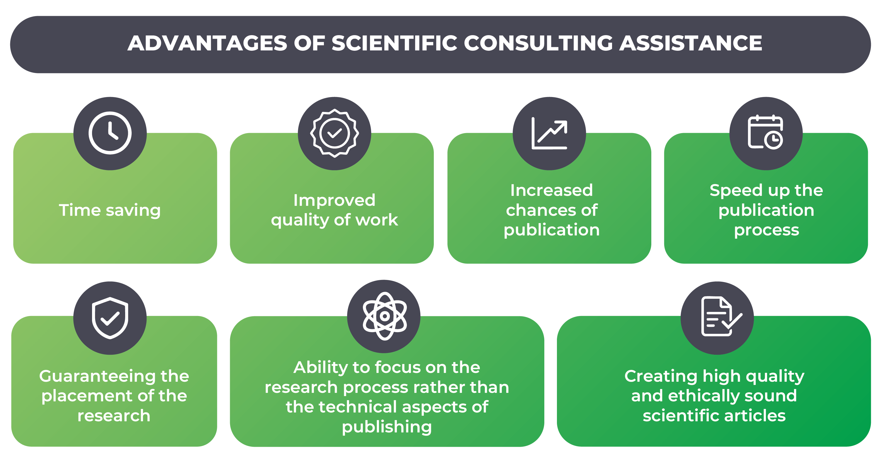 - Guarantee placement of the research in a reputable publication. Consulting contributes to successful publication and guarantees placement of the research in a suitable journal. Mistakes in going through all the publication steps on your own can result in significant delays in publication of months or even years.